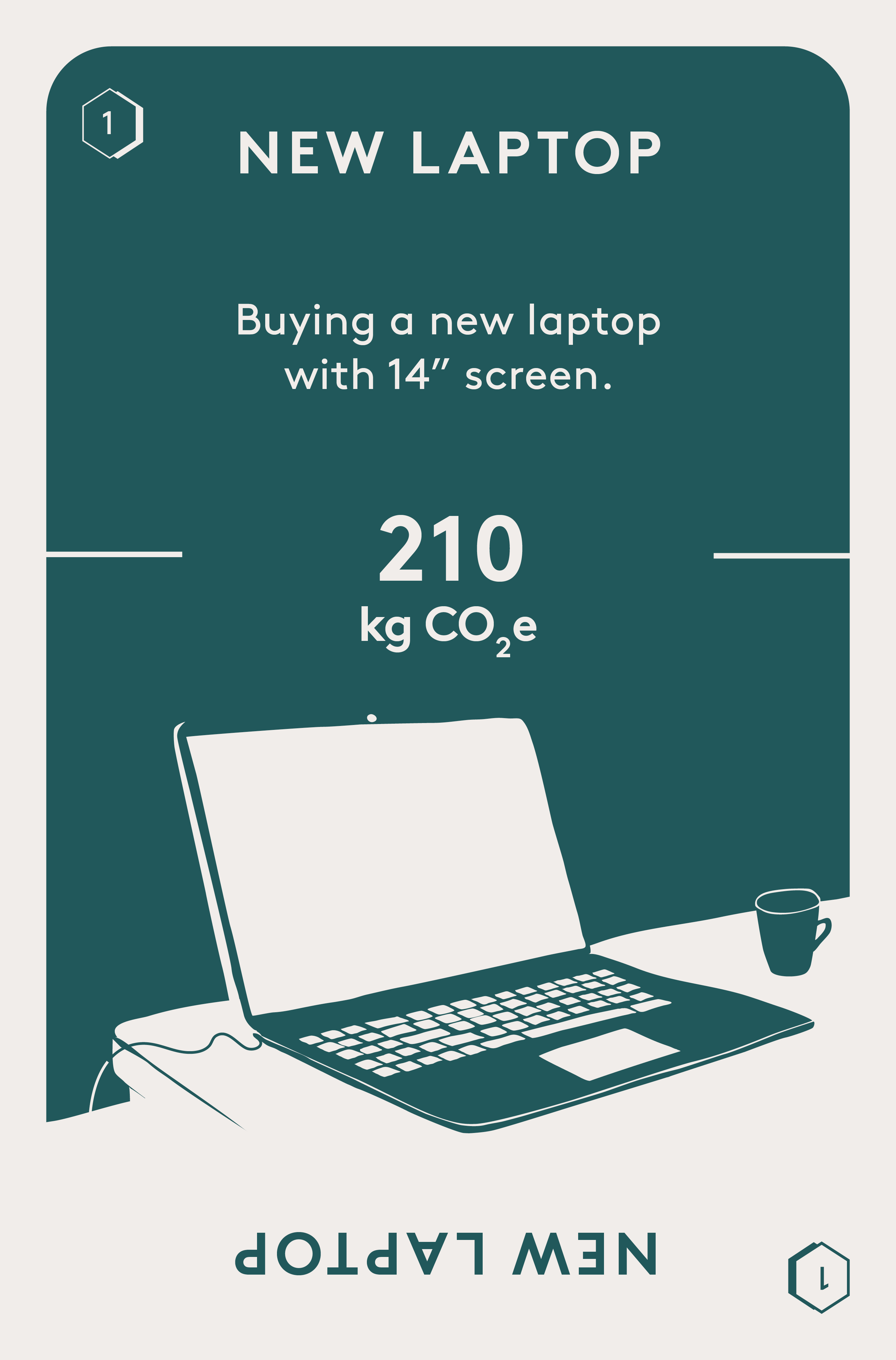 The emission value is based on a life cycle assessment conducted by Apple, and refers to a MacBook Pro 14” (Apple, 2021a). The emission value includes energy usage in the factory, as well as in the extraction and refinement of raw materials. Additionally, emissions from the transportation of materials and components to the factory, as well as the transportation of the finished computer to stores, are included. Emissions that occur during the computer’s use (e.g., from electricity consumption) and from waste management and recycling after the computer has been discarded are not included. The data value has been rounded from 209 to 210 kg CO2e on the card.