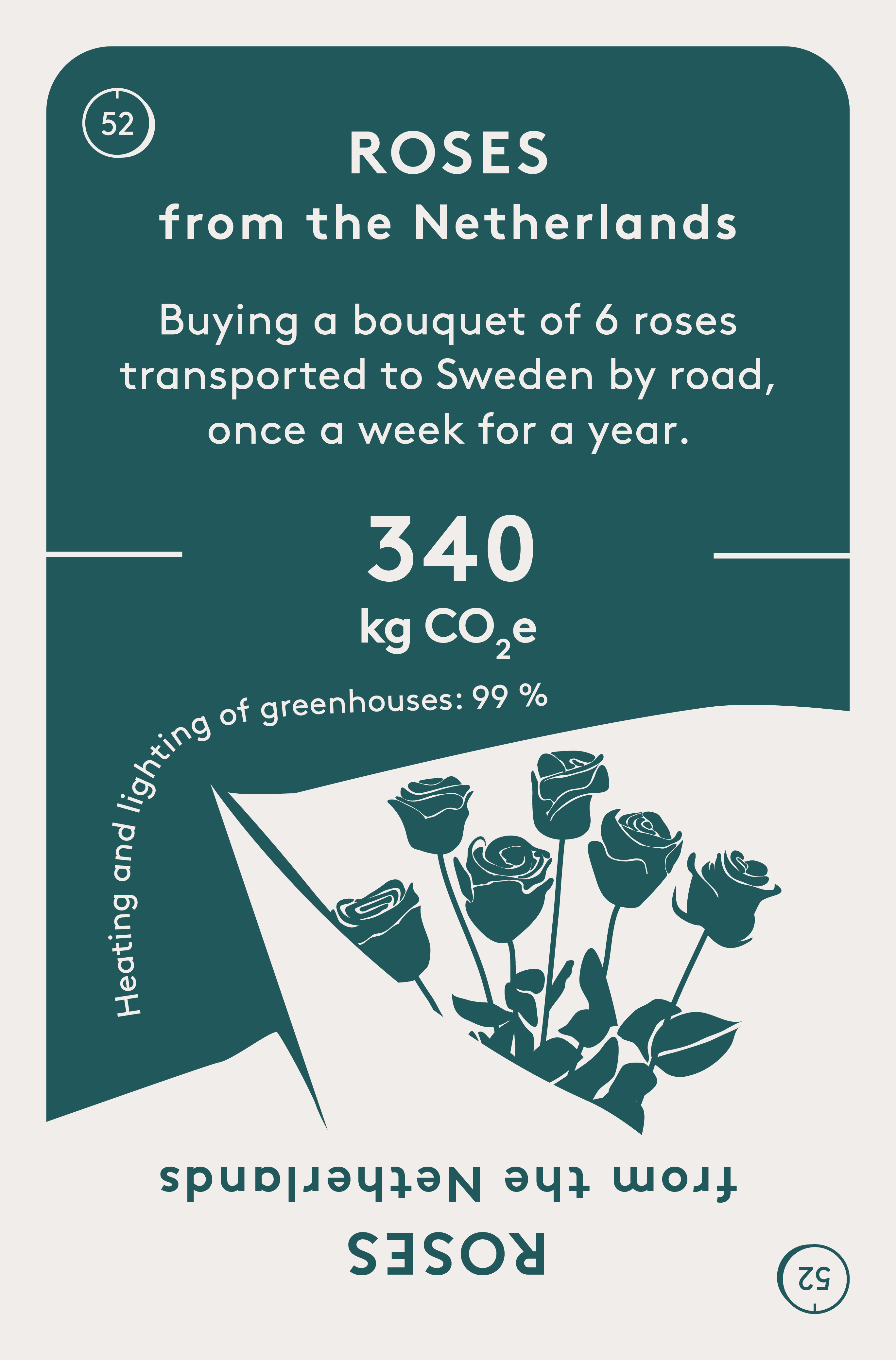 The roses are cultivated in a greenhouse in the Netherlands and transported to Sweden by truck. To calculate the greenhouse gas emissions, we have included emissions from the consumption of electricity and natural (fossil) gas in the greenhouse in the Netherlands, as well as emissions from transportation. Electricity and gas are primarily used for heating and lighting in the greenhouse. The following data has been used to calculate emissions from cultivation: