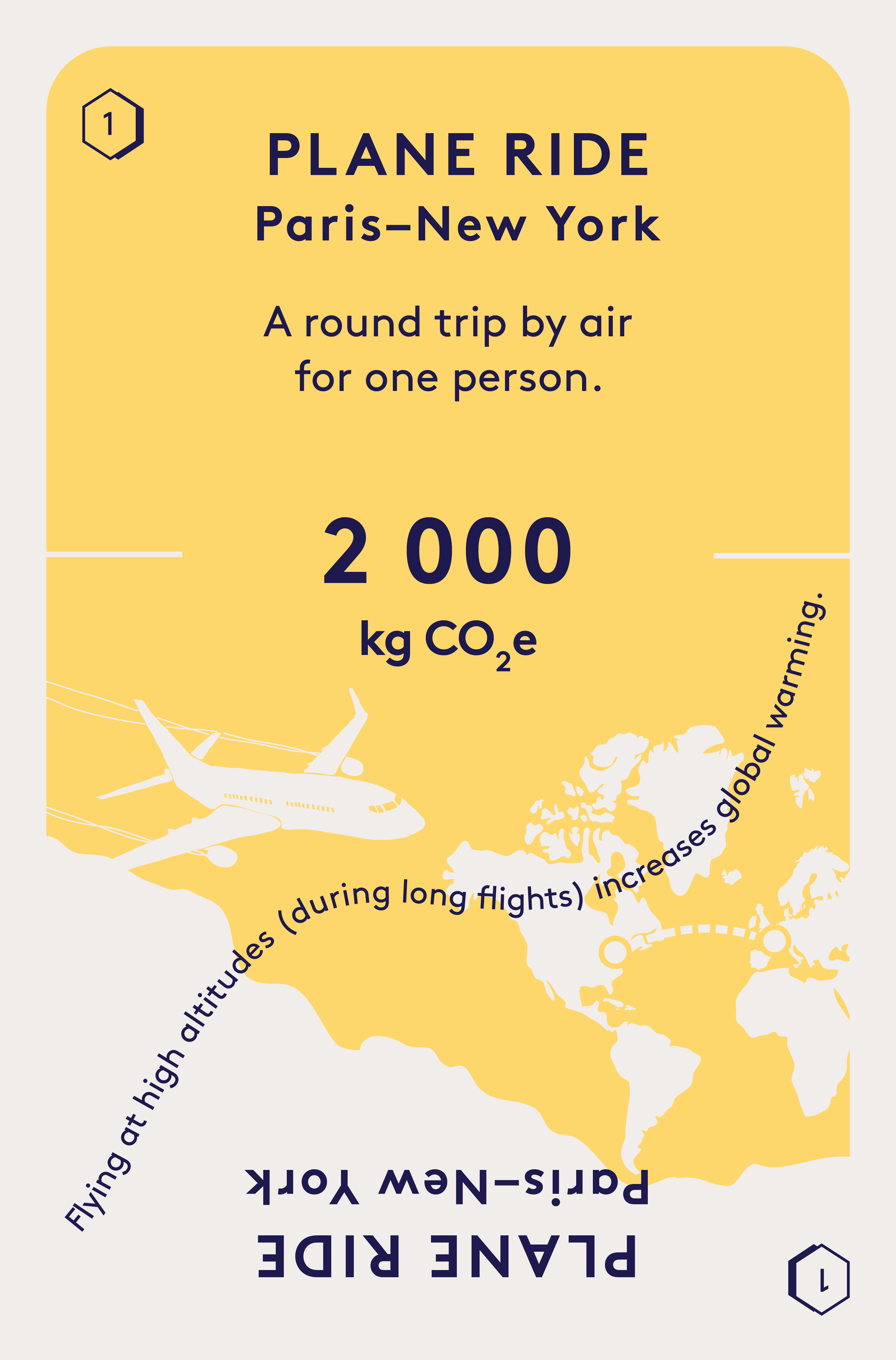 When emissions occur at high altitudes, the climate impact is enhanced compared to emissions at ground level. The extent of the climate impact amplification depends on the altitude where the emissions take place, which, in turn, is influenced by the distance traveled (the greater the distance, the higher the aircraft flies). In this case, the climate impact is enhanced by 70%. To include the high-altitude effect, the direct climate impact is multiplied by a factor of 1.7. This results in a total climate impact of 1 997 kg CO2e (1 175 kg CO2e × 1.7), which has been rounded to 2 000 kg CO2e on the card.