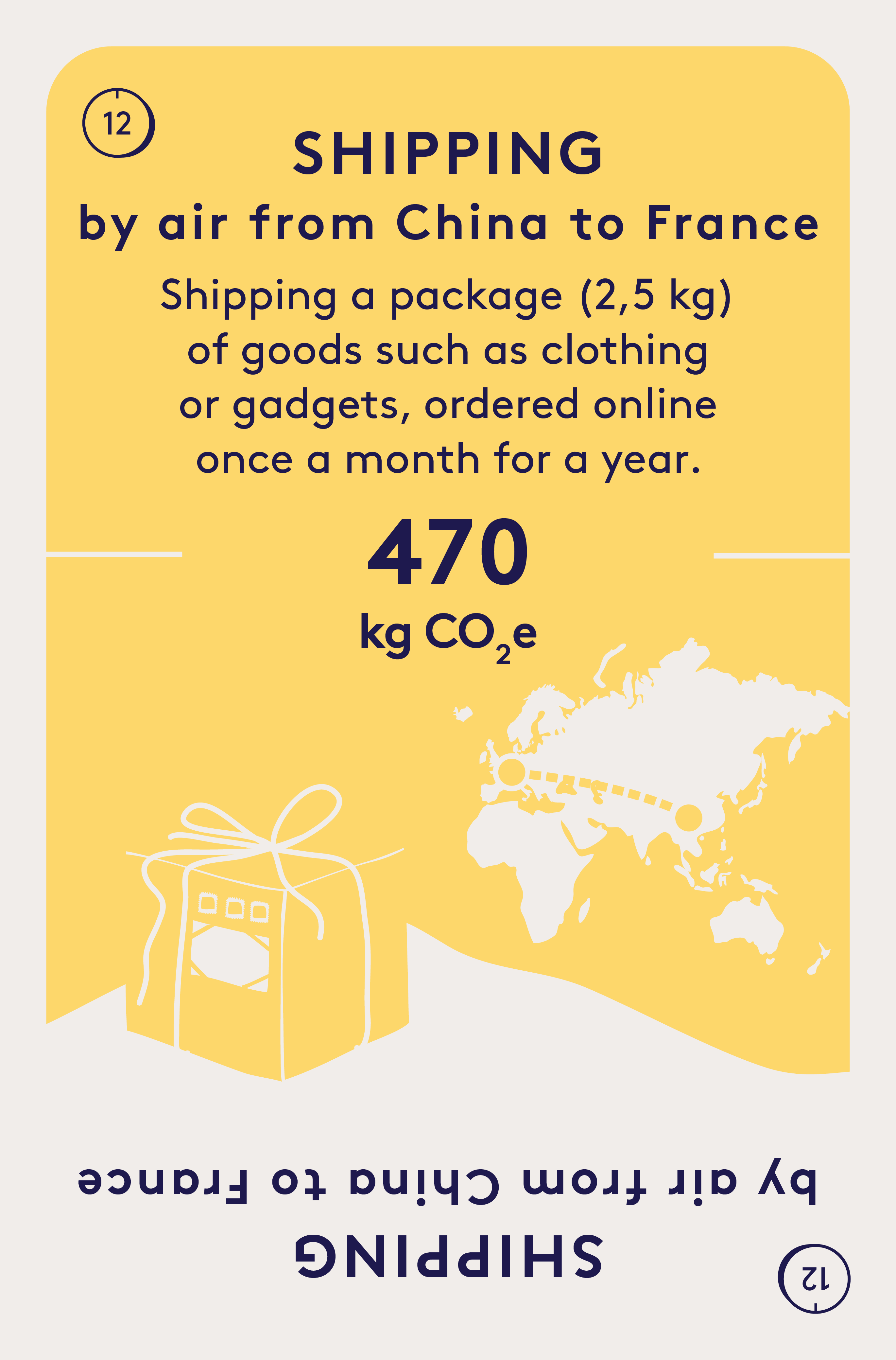 - Transportation distance by truck: 200 km (the total distance between the factory and the airport in China, and between the airport in France and the recipient’s home).