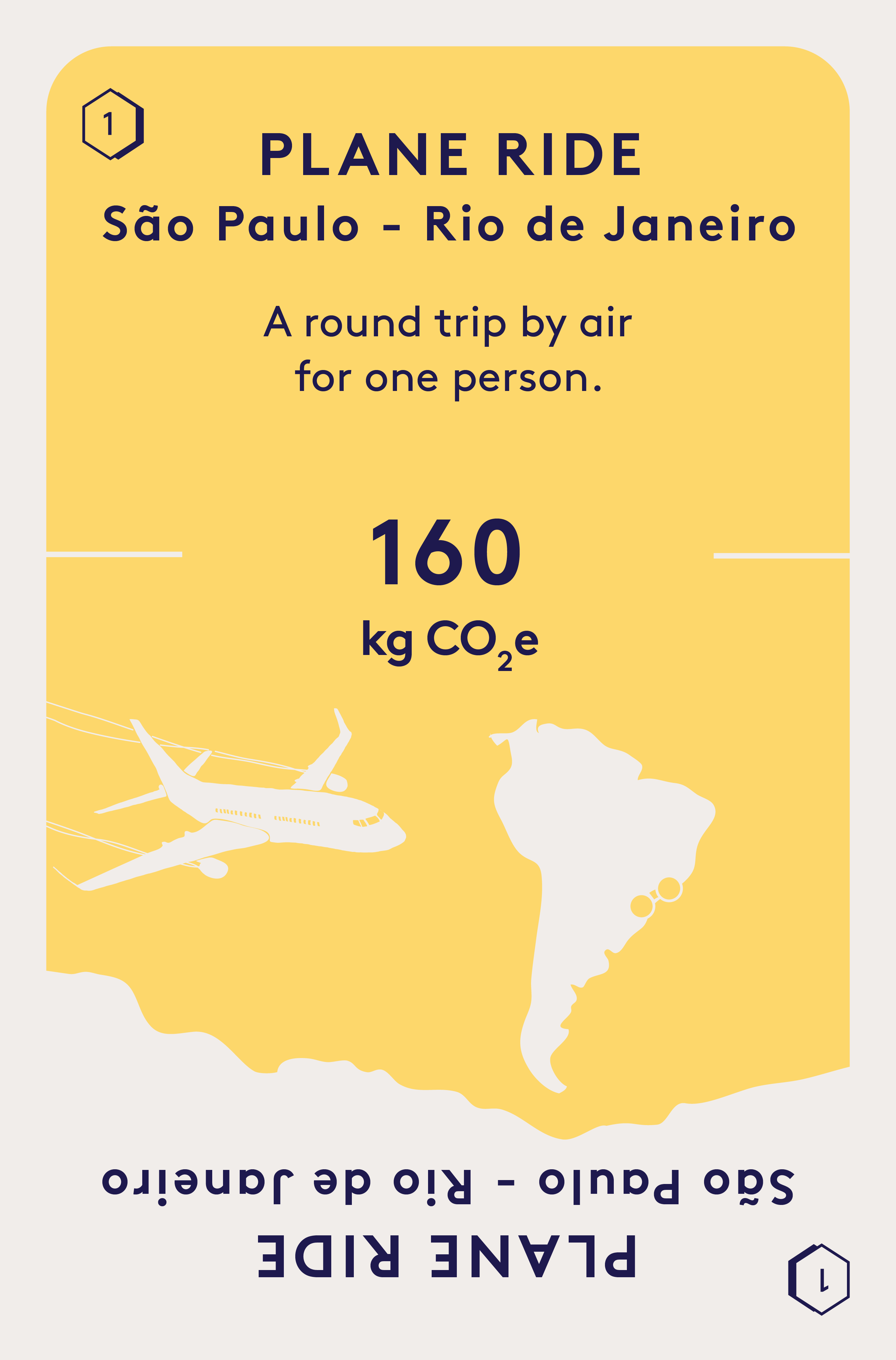The calculation shows that the round trip between São Paulo and Rio de Janeiro causes emissions of 155.5 kg CO2e, which has been rounded to 160 kg CO2e on the card.